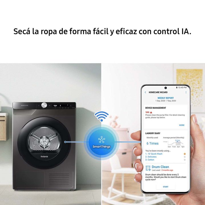 9 Kg | CONTROL IA | TECNOLOGIA HEATPUMP | DIGITAL INVERTER | SECADO RÁPIDO 35 SECADO INTELIGENTE Secá la ropa de forma fácil y eficaz con control IA. Esta tecnología personaliza el secado recordando tus hábitos, sugiriendo ciclos y mostrando información puntual. Una SmartThings App proporciona conse...