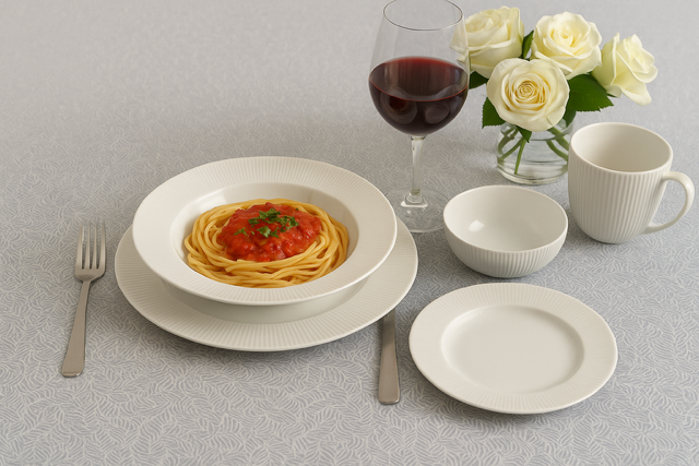 Juego de Vajilla formado por 12 piezas de porcelana color Hueso. Contiene : - 4 platos playos de 28 cms de diametro. Borde guarda de 4,2 cms con lineas ( estriada) - 4 platos postre de 22 cms de diametro .Borde guarda de 3,2 cms con lineas guarda estriada - 4 bowls de 13 cms de diametro / Altura : 7...