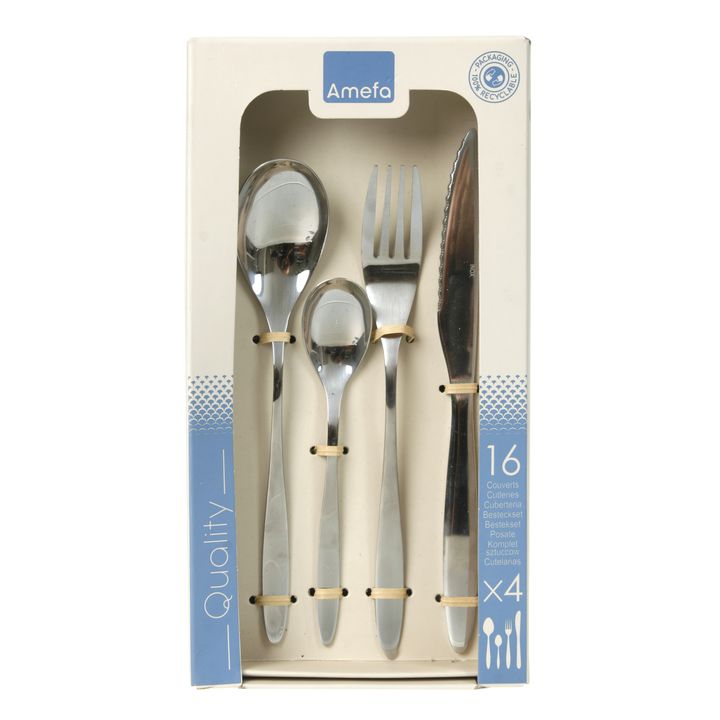 Set compuetso por 16 piezas , modelo ACTUAL Material : Metal Acero Inoxidable 201 Forjado Dimensión: 27CM-1,5/1,2MM Número de piezas: 16 unidades , 4 cuchillos, 4 tenedores, 4 cucharas y 4 cucharitas Forma: Rectangular Color: Acero Acabado: Brillo Características Técnicas: Material 100% saludable 10...