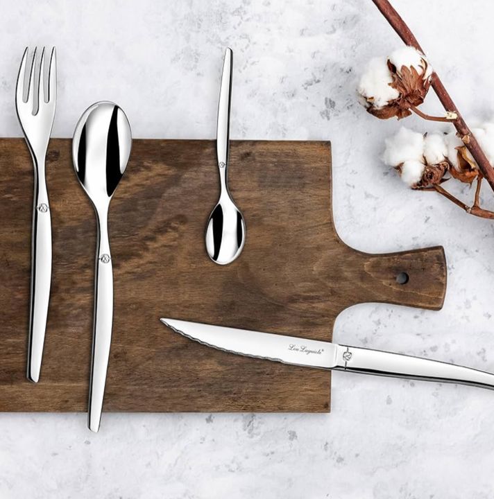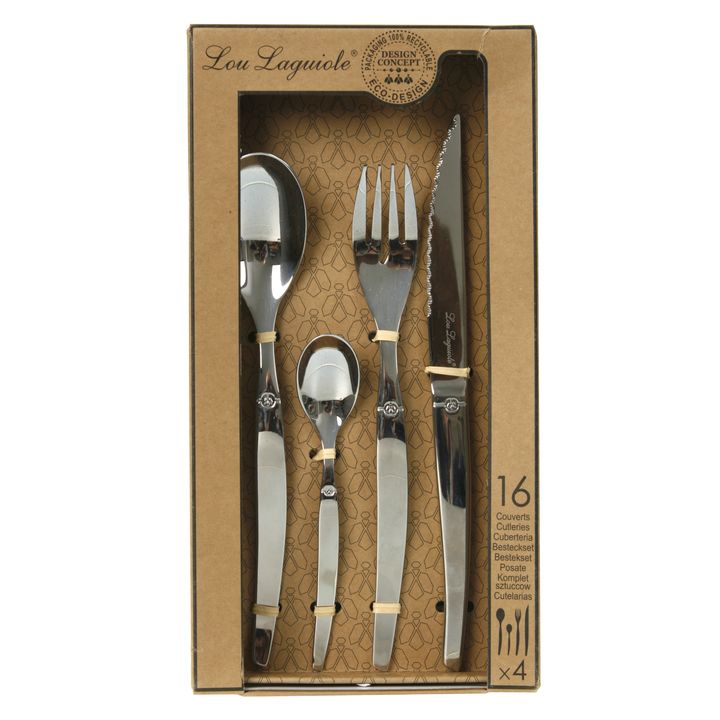 JET - Juego de cubiertos pulido alto brillo Son de acero inoxidable 18/0 , con un espesor de 2,5 mm y acabado brillante Lou Laguiole - JET - Juego de cubiertos 16 piezas - 4 personas - pulido alto brillo - color plata Este juego de 24 piezas consta de: • 4 cuchillos de mesa • 4 tenedores de mesa • 4...