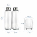 Incluye 2 botellas de vidrio de 1 litro + 6 vasos de 369 ml, combinando diseño elegante con practicidad.