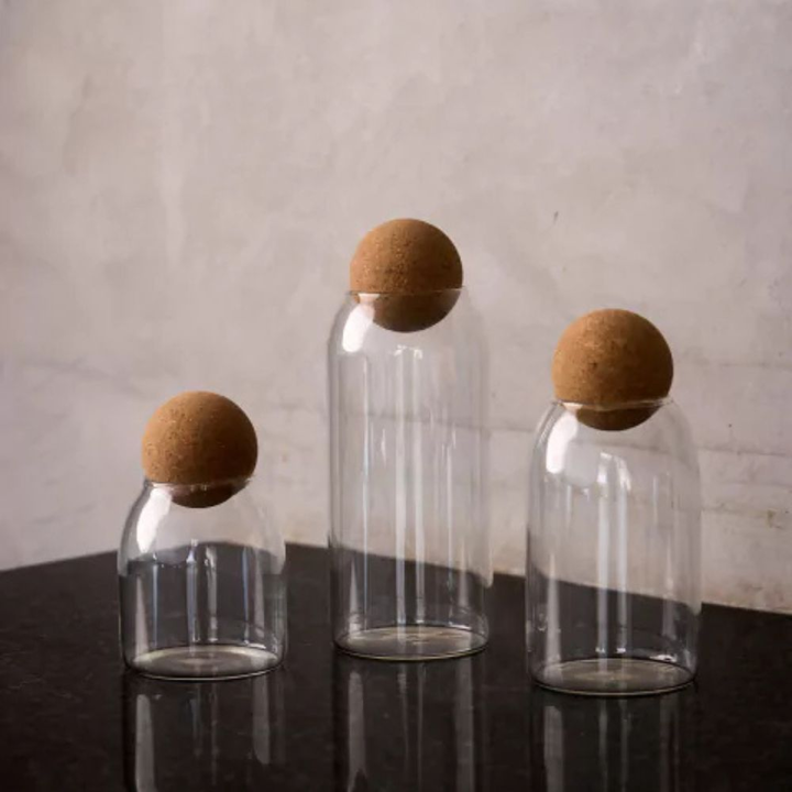 <p><em> </em><br /><em>Set de 3 frascos de vidrio transparente con tapa esférica de corcho. Ideales para cocina baño o decoración. Combinan perfectamente con ambientes modernos minimalistas o estilo nórdico<...
