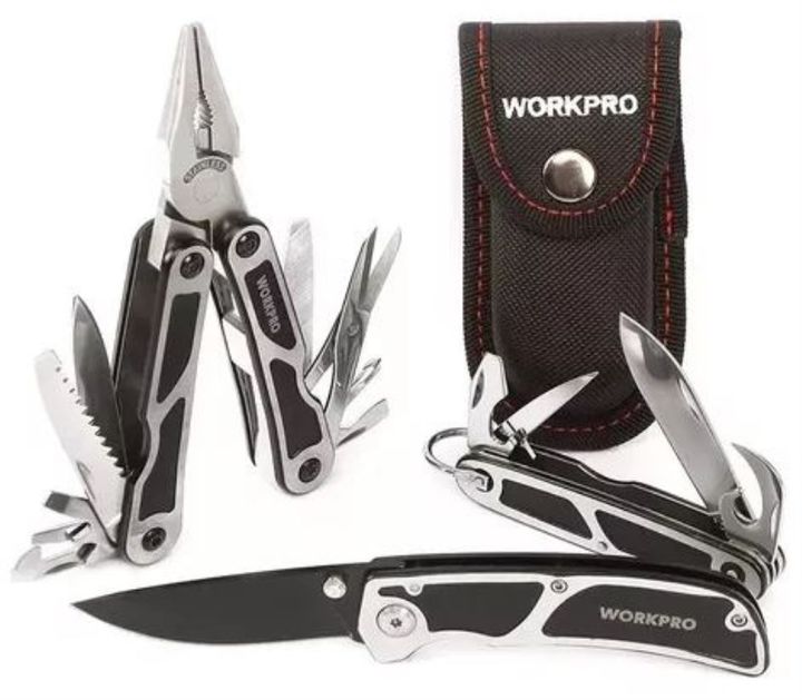 SET 3 HERRAMIENTAS MULTIFUNCION W000316WORKPRO # Herramienta multifunción 15 en 1. # Herramienta mini multifunción. # Cuchillo plegable. # Hechos en acero inoxidable. # Diseño compacto plegable. # Selección ideal para uso general. # Incluye estuche de nylon. Garantía 12 meses Origen China.