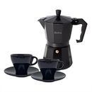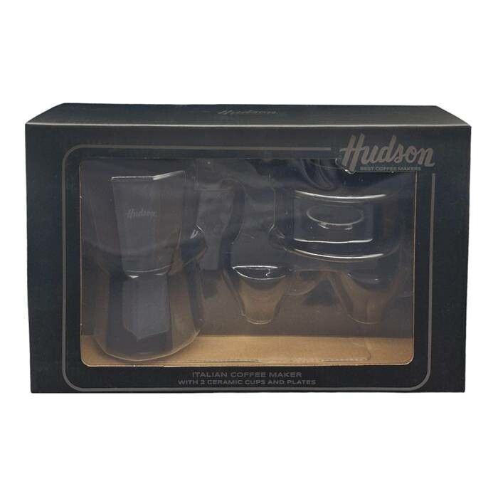 Set de Cafetera Italiana + 2 Pocillos de cerámica con platos Total black Hudson Las cafeteras tipo Italianas Hudson son aluminio, un material que te asegura durabilidad y excelente prestación. Simplemente desenrosca la parte superior de la cafetera, retira el embudo y coloca agua natural. Volve a co...