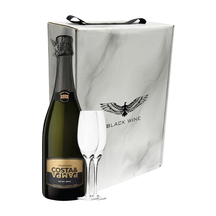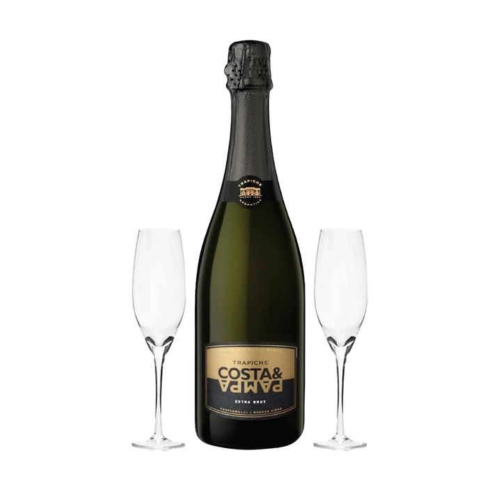 Incluye: 1 Botella de Espumante Set Costa & Pampa Extra Brut y 2 Copas c/ Estuche
