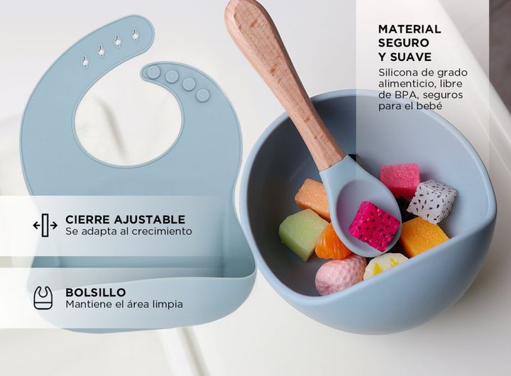Este set de alimentación para bebés es la combinación perfecta de seguridad, comodidad y practicidad. Fabricado en silicona de grado alimenticio, garantiza que tu bebé disfrute de sus primeras comidas con total seguridad. El babero, suave y flexible, cuenta con un bolsillo recogemigas para mantener ...