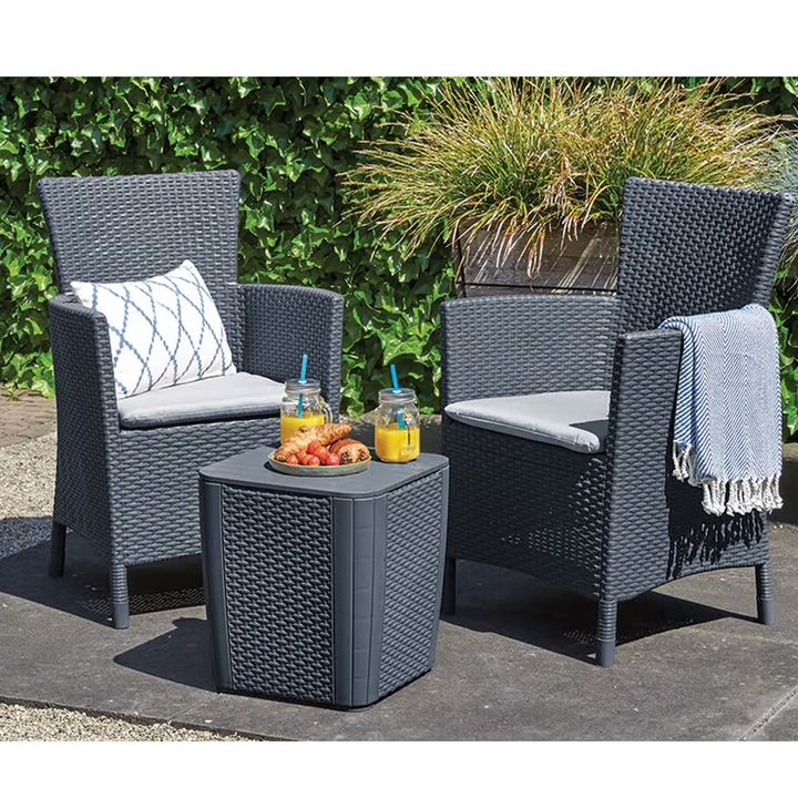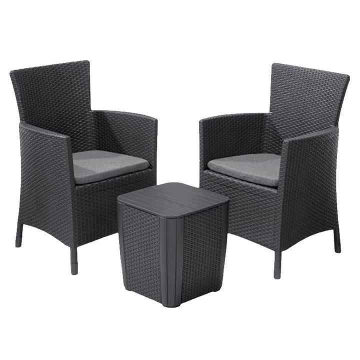 Conjunto de exterior de 2 plazas Iowa - Grafito Dimensiones de la silla 62x60x89 Cm Capacidad de asientos de la silla 240 Kg Colección Iowa Profundidad externa 60 Cm Altura externa 89 Cm Anchura externa 62 Cm Peso del envío 15.6 Kg Capacidad de carga 110 Kg Material Resina Peso del Producto 13.5 Kg ...