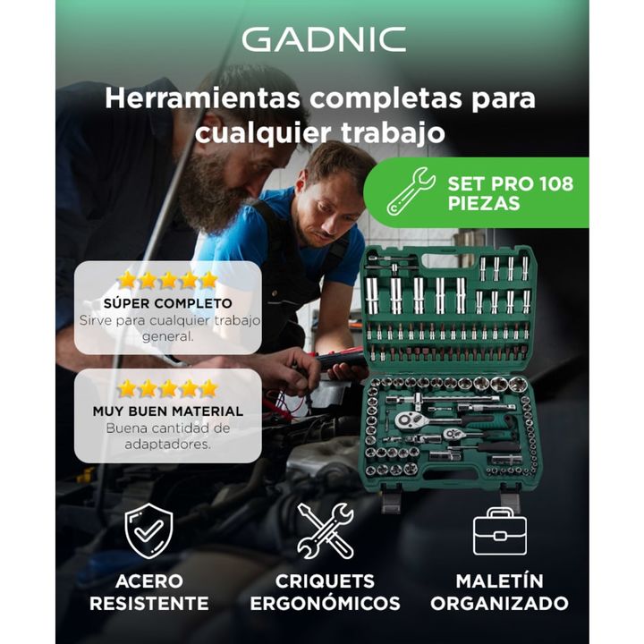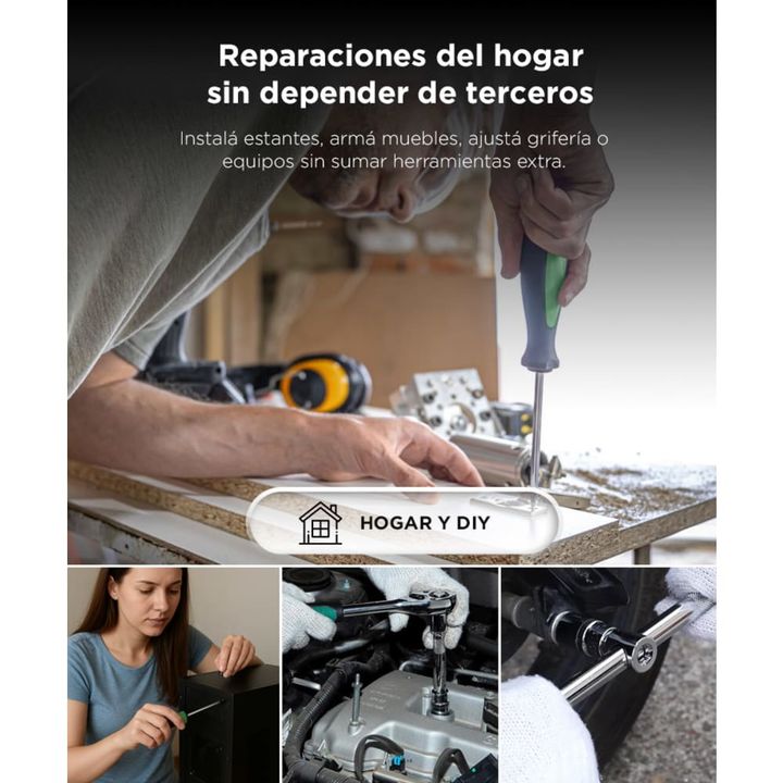 Versatilidad para todo tipo de trabajos Este juego de herramientas de 108 piezas ofrece una solución completa para reparaciones del hogar mecánica automotriz y trabajos de precisión. Incluye dados de diferentes medidas puntas de múltiples tipos y herramientas esenciales para un ajuste seguro y efect...
