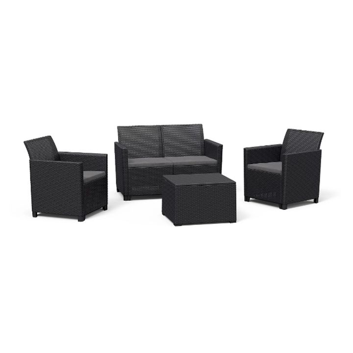 Set de Jardín Keter Emma 2 Sillas 1 Sillón 1 Mesa Graphite Origen: Nacional Marca: Keter Alto: 81 cm Ancho: 178 cm Peso: 34 kg Modelo: EMMA Garantía: 12 meses Tipo de producto: Set de exterior Material: Polipropileno Requiere armado: Sí Peso máximo soportado: 120 kg