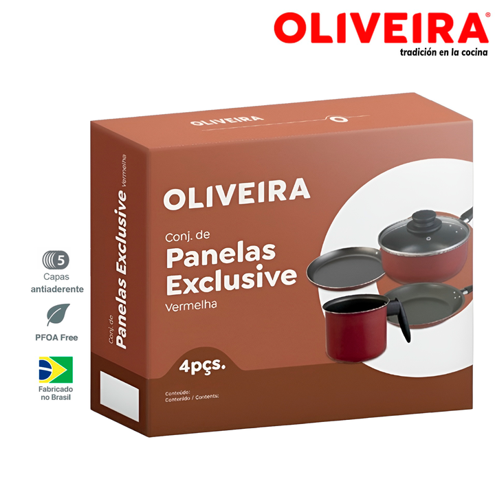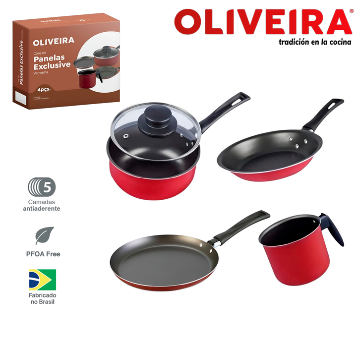 OLIVEIRA JUEGO 4 PIEZAS EXCLUSIVE RED SKU: 2174 Este set consta de cuatro piezas, entre ellas: una cacerola con tapa de cristal que permite ver los alimentos mientras se cocinan, además de una sartén francesa, una sartén para panqueques sin tapa y un hervidor. Totalmente fabricado en aluminio con re...