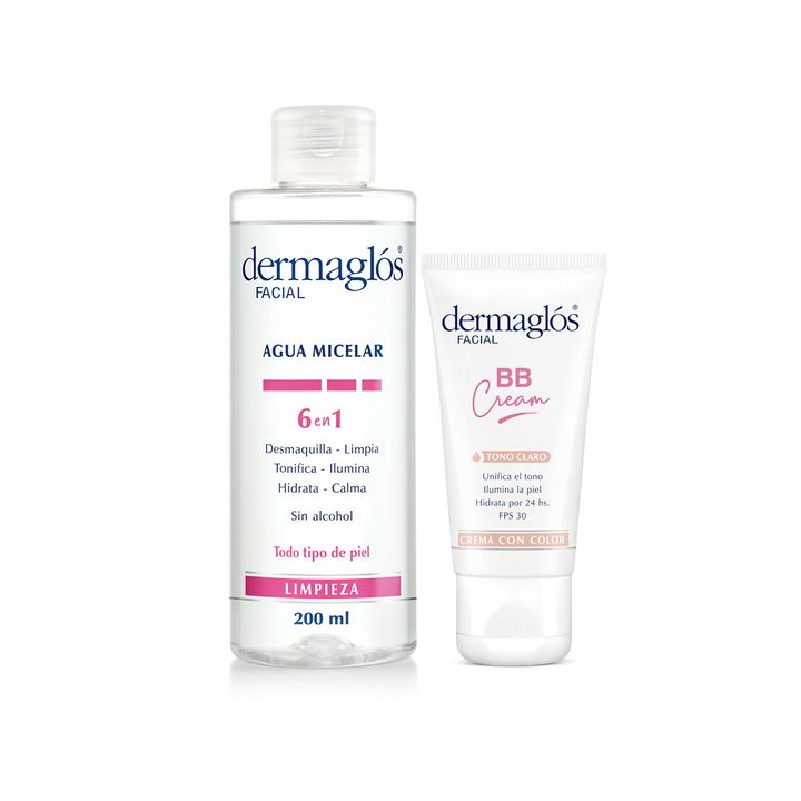 Componentes Dermaglos Facial Agua Miceral 6 En 1 Limpieza Ttp 200ml Código: 7793742007415 | SKU: 008091 x 1 uni Dermaglos Facial Crema Bb Cream Tono Claro Fps 30 50g Código: 7793742007958 | SKU: 008080 x 1 uni