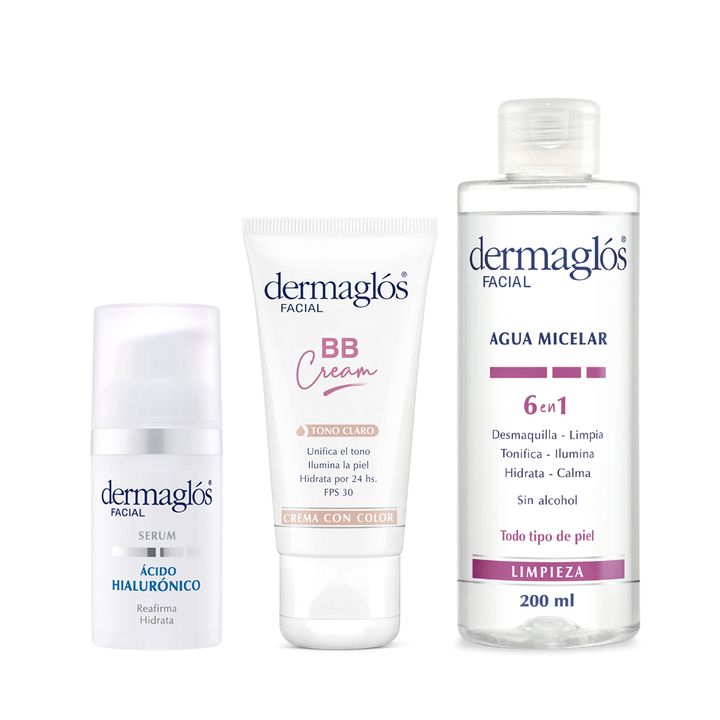 Componentes Dermaglos Facial Crema Bb Cream Tono Claro Fps 30 50g Código: 7793742007958 | SKU: 008080 x 1 uni Dermaglos Facial Agua Miceral 6 En 1 Limpieza Ttp 200ml Código: 7793742007415 | SKU: 008091 x 1 uni Dermaglos Serum Facial Doble Acido Hialuronico 30ml Código: 7793742007118 | SKU: 008113 x ...