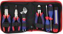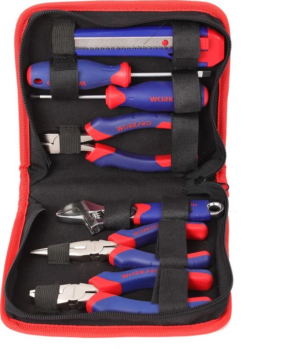 JUEGO DE HERRAMIENTAS 7 PIEZAS W009110 EN CARTUCHERA WORKPRO # Pinza media caña de 6. # Alicate corte oblicuo de 6. # Pinza universal de 6. # Cutter de 18 mm. # 2 Destornilladores: PH1x75mm, Plano 5x75mm. # Llave ajustable de 6 con cartuchera. Garantía 12 meses Origen China.