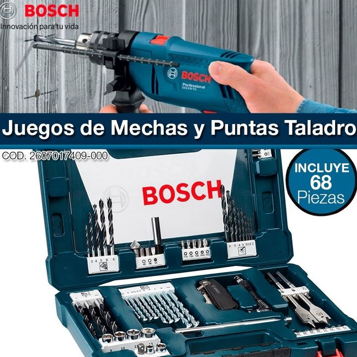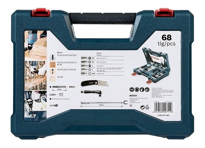 SET DE 68 PIEZAS MECHAS Y PUNTAS - Bosch Art. 2607017409-000 Contenido • 1 varilla imantada, telescópica • 1 cutter • 1 atornillador manual angular • 8 mechas para metal de Ø 2-6 mm: 2 de 2/3 mm, y 1 de 2,5/4/5/6 mm • 9 mechas para mampostería de Ø 4-10 mm: 2 de 5,5/6 mm, y 1 de 4/5/7/8/10 mm • 8 me...