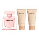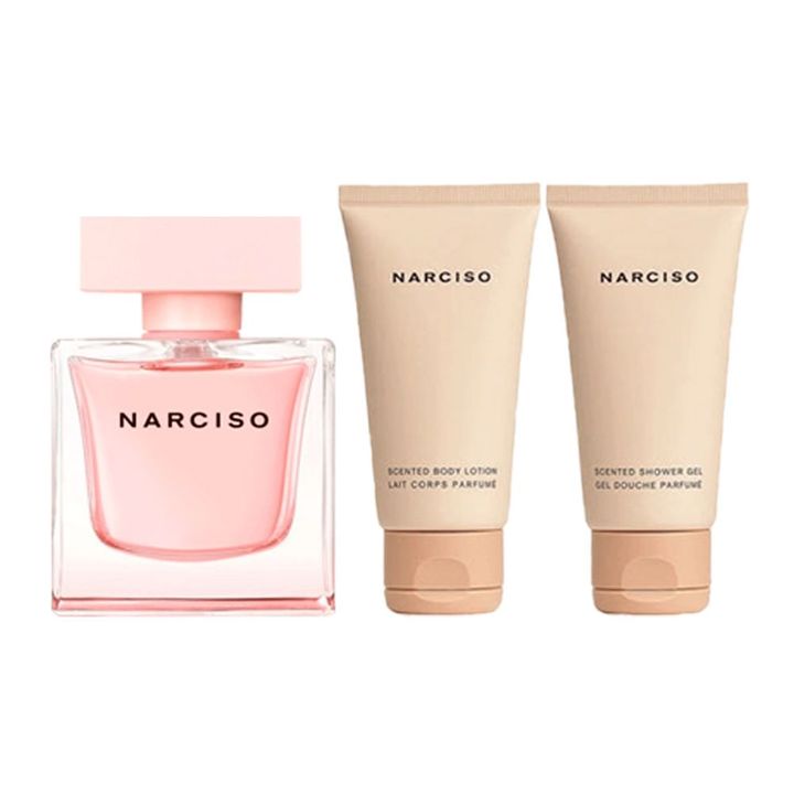 Set incluye tres productos: Narciso Eau de Parfum Cristal 50ml + loción corporal 50ml + gel de ducha 50 ml. Almizcle floral amaderado. Notas: bergamota, rosa, corazón de almizcle, madera de cedro.