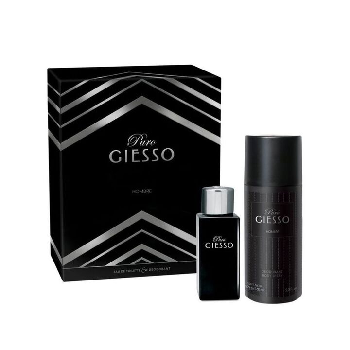 Set incluye dos productos: Giesso Puro Hombre EDT 50 Ml + desodorante 160 ml. Frutada – Especiada – Maderosa: Notas de salida: Limón – Naranja – Ananá – Tagette S. África – Salvia – Manzana. Notas de cuerpo: Cardamomo – Canela – Bálsamo de Tolú – Madera de Rosa. Notas de fondo: Ámbar – Patchouli.