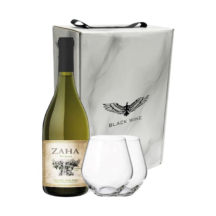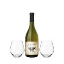 Set Vino Blanco Zaha Chardonnay y 2 Copas Sin Pie Con Estuche