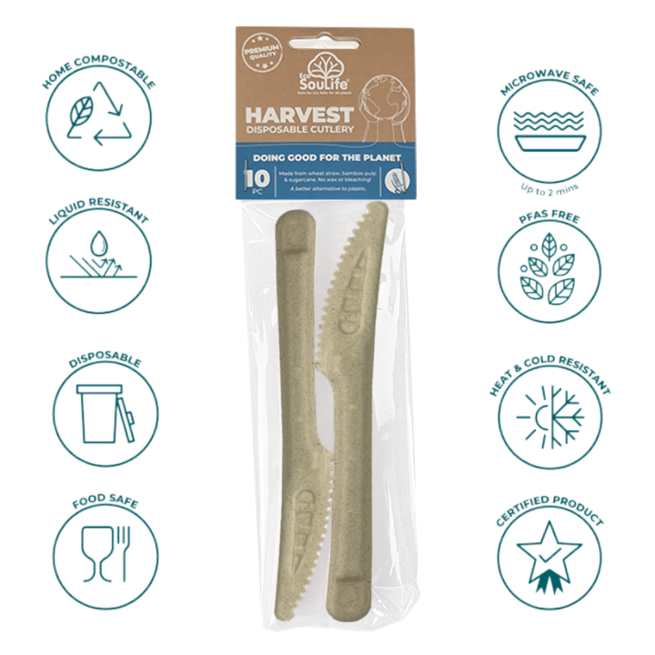 Set x 10 Cuchillos Descartables Ecológicos aptos para Compost, Aptos para toda ocasión! Disfruta de una experiencia gastronómica plena sabiendo que tus cubiertos están hechos con subproductos de trigo renovables, lo que los convierte en una alternativa sostenible al plástico o al PLA. Además, son lo...