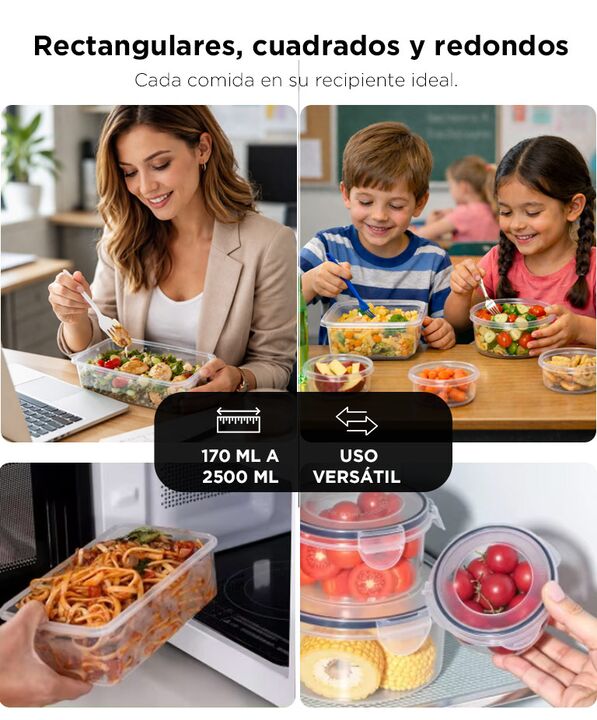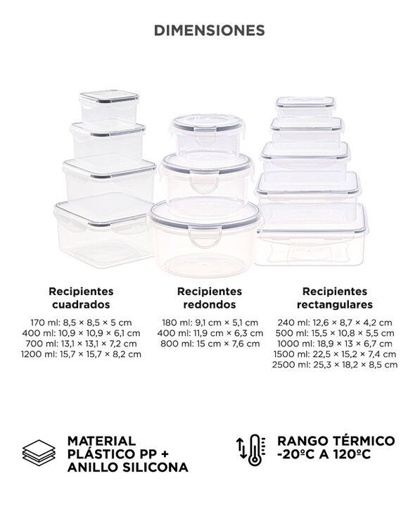 Set completo para organizar comidas diarias: El Juego de Táperes GADNIC FRASKIT9 incluye 12 recipientes de distintos tamaños, ideales para preparar, guardar y transportar alimentos en el día a día. Cierre hermético con anillo de silicona: Cada tapa cuenta con sellado firme que ayuda a conservar la f...