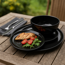 Set compuesto por 18 piezas de Ceramica Oslo Brillante en color Negro Material: Cerámica de alta calidad con bordes Curvos. Apto para lavavajillas: Sí Apto para microondas: Sí Composicion : - 6 platos playos Ceramica 27 Cms , Altura 2,5 cm. - 6 platos de postre Ceramica de 20 cm, Altura: 2.5 cm - 6 ...