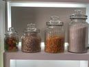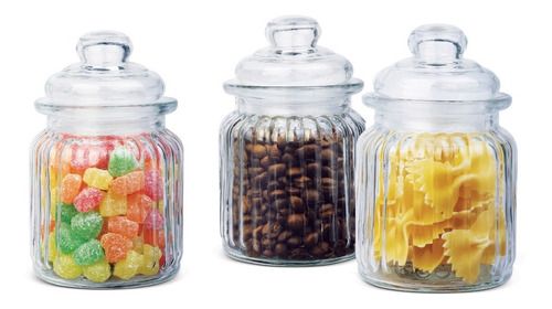 3 unidades de : Frasco Caramelero Mini de Vidrio Capacidad : 250 ml Ideal para multiples usos en la cocina , souvenirs de cumpleaños o guardar especies, ganchitos, etc Medidas 12 cm de altura x 7 cm de diámetro.