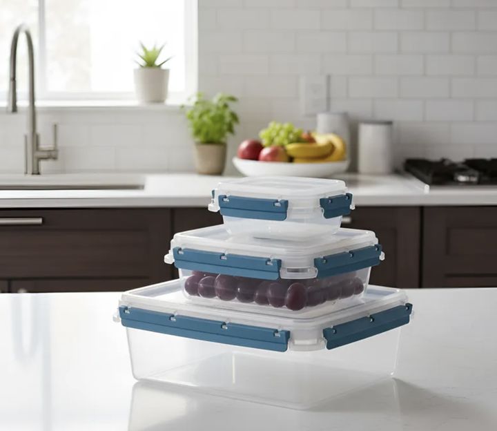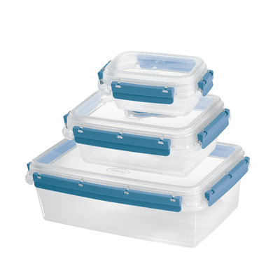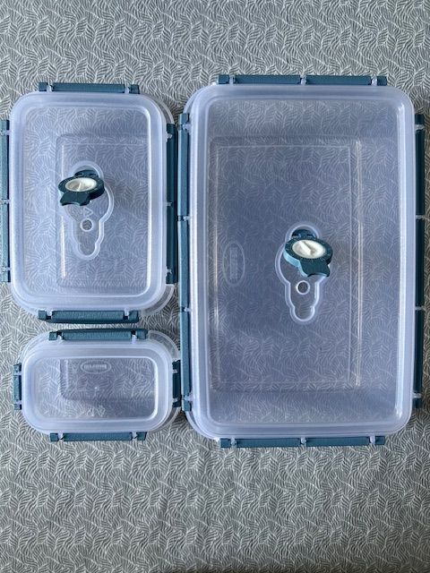 Set x 3 hermeticos Recipientes plasticos de la mas alta calidad para alimentos con tapa de cierre a presión clip e indicador de fecha y orificio para permitir entrada de aire en el modelo grande 3 lts y mediano 0,9 lts. Dimensiones: Capacidad : 0,3 L Medidas : 9,5 x 14,5 x 5,7 cm de alto Capacidad :...
