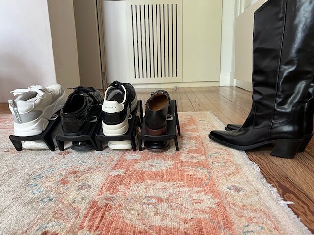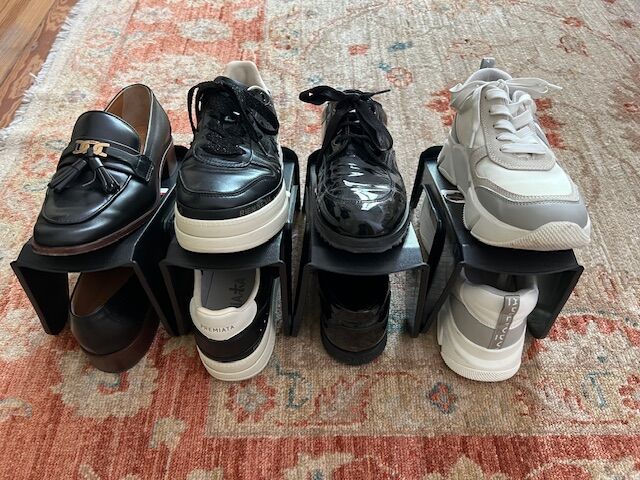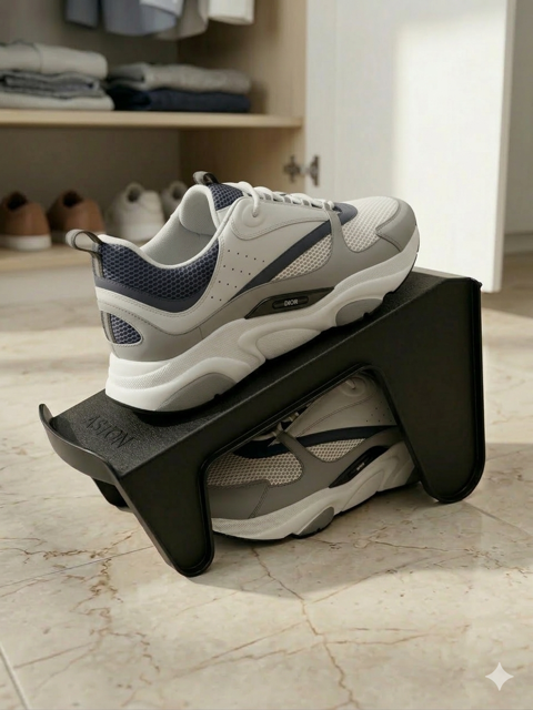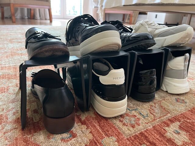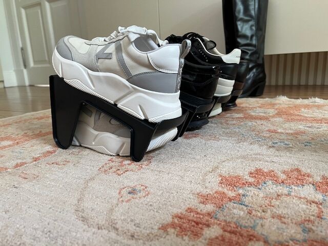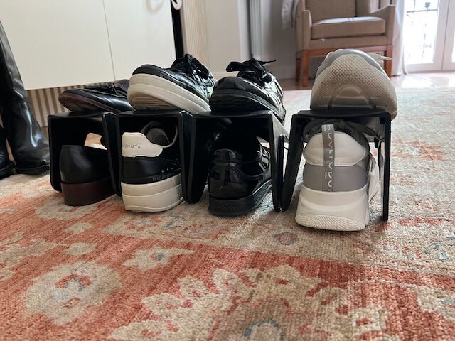 Set x 4 unidades de Soporte plastico para organizar los zapatos. Se coloca 1 zapato arriba y uno abajo , sirve para colocar desntro de un ropero o simplemente en el piso ayudando al orden de los zapatos. Material : es de plastico negro Medidas son : Ancho : 11,5 cm Largo : 26 cm Alto maximo : 14 cm ...