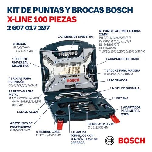 SET X-LINE BOSCH CON 100 ACCESORIOS PERFORAR Y ATORNILLAR Beneficios Completo maletín para los aficionados al bricolaje y para trabajos en madera, mampostería y metal Bricolaje con calidad Bosch CONTENIDO DEL SET - 18 mechas para metal HSS-TiN de Ø 1/1,5/2/2/2,5/3/3/3,5/4/4/4,5/5/5,5/6/6,5/7/8/10 mm...