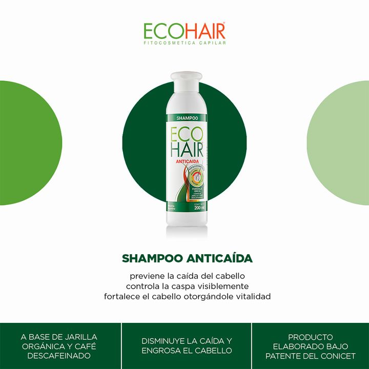 Shampoo Eco Hair Crecimiento Cabello Anticaida 200 ml ETAPAS DEL TRATAMIENTO A partir de las 2 semanas se observará disminución de la caída del cabello, disminución de la caspa y fortalecimiento del cabello. Con el uso diario de shampoo ECOHAIR ANTICAIDA se observará crecimiento progresivo del cabel...