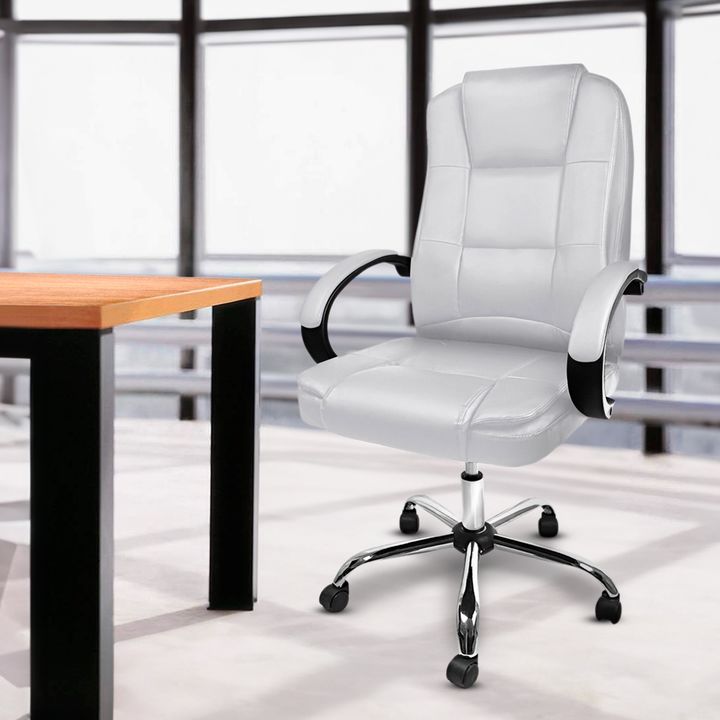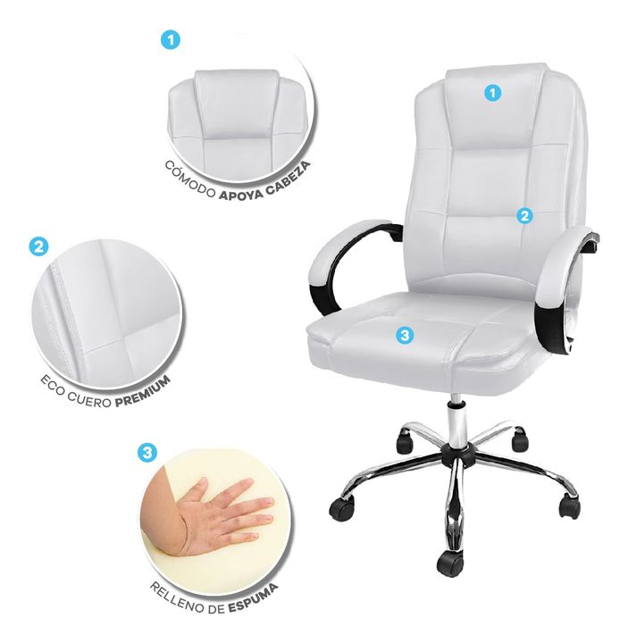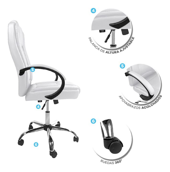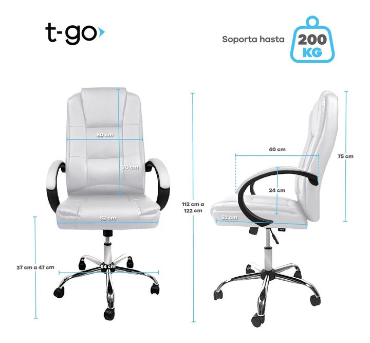SILLA DE ESCRITORIO T-GO ERGONÓMICA ACOLCHADA DE ECO CUERO -Confortable y duradera. -Altura ajustable. -Cómodos apoyabrazos acolchados. -Asiento acolchado con triple espuma. -Soporte lumbar regulable. -Posee apoya cabeza. -5 ruedas con giro de 360° y silenciosas. -Giratoria. -Peso máximo soportado: ...