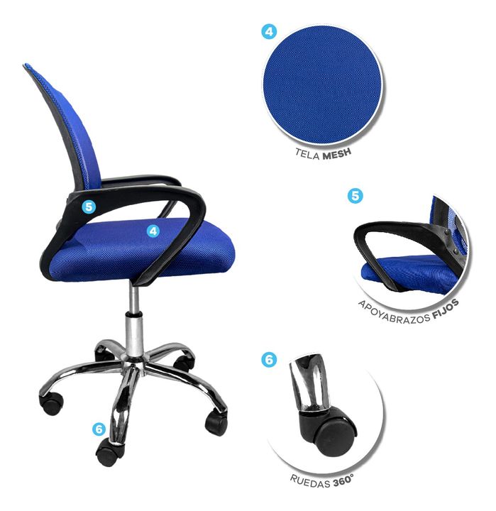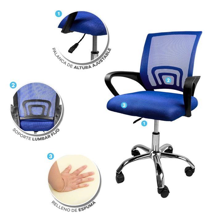 SILLA T-GO DE OFICINA CON SOPORTE LUMBAR FIJO -Apoya brazos fijos acolchonados reforzados -Recubierta de tela mesh respirable -Ergonómica -Construida sobre estructura metálica -Espuma de alta densidad recubierta en cuero ecológico -5 Ruedas de 2 pulgadas supersilenciosas -Mecanismo de balanceo -Dobl...