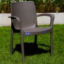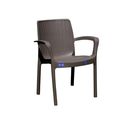 Super reforzado y apilable. Para uso interior y exterior. Resistencia UV (intemperie). Alto: 85 cm. Ancho: 55 cm. Profundidad: 60 cm. Color Mokka.
