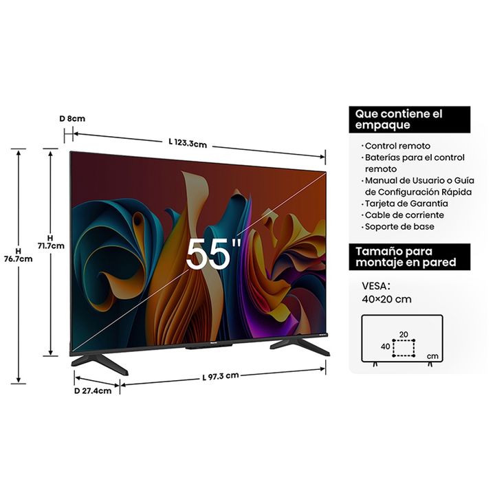Ficha Técnica Smart TV Hisense 55Q6N Pantalla: QLED Pulgadas: 55 Resolución: 4K Ultra HD (3840 x 2160) Tipo de TV: Smart Sistema operativo: Google TV Bluetooth: Sí Wi-Fi: Sí USB: Sí (2 puertos) HDMI: Sí (3 puertos) Control remoto: Sí Accesorios: Control remoto, cable de alimentación, manual Aplicaci...