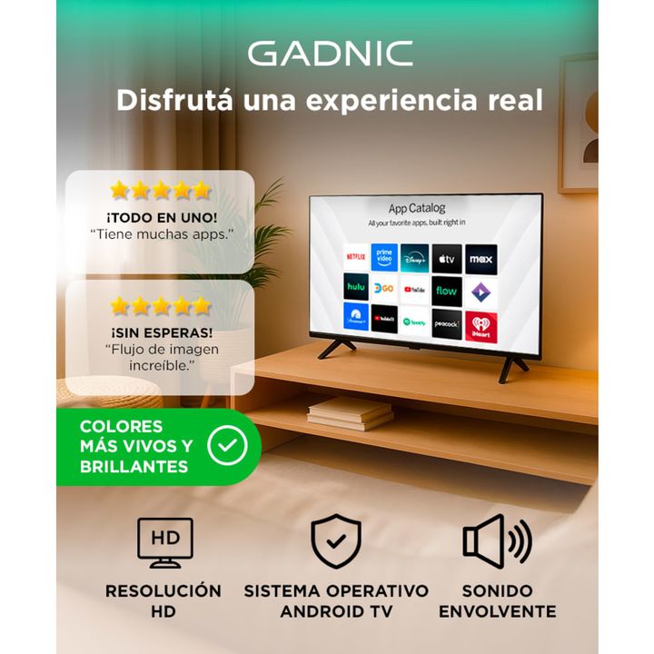 Entretenimiento inteligente en alta definición El Smart TV Gadnic de 32 pulgadas combina tecnología avanzada con un diseño moderno y compacto. Su pantalla HD de panel LG ofrece imágenes claras y vibrantes, ideales para disfrutar películas, series o videojuegos con excelente nitidez. Rendimiento flui...