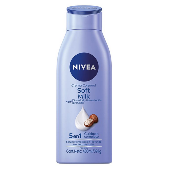 La Crema corporal Soft Milk 5 en 1 de NIVEA nutre la piel desde la primera aplicación gracias a su serum de humectación profunda y a su ingrediente principal: Manteca de Karité. Posee 5 beneficios en 1: 48 horas de humectación profunda, brinda un cuidado indulgente, rápida absorción, deja suave la p...