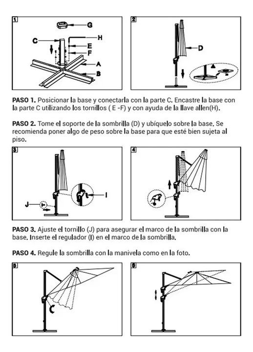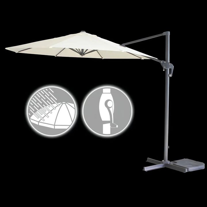 SOMBRILLA LATERAL DE ACERO REFORZADA LUSQTOFF LQ50-04B PARA JARDÍN 3M MANIVELA PROTECCIÓN UV Ideal para jardines, patios y terrazas ESPECIFICACIONES: - Diámetro: 3 mts - Costillas: acero reforzado - Tubo principal: 48 x 1 mm - Tubo pivot: 42 x 0,9 mm - Costillas reforzadas: 12 x 18 x 0,45 mm - Inclu...