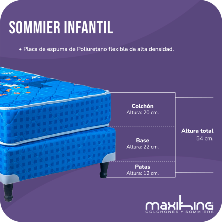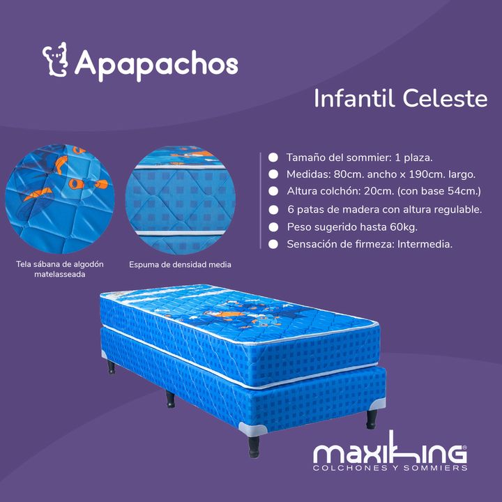 Sommier y Colchon Maxiking Infantil 1 Plaza 80x190x20cm de Espuma Tela Acolchada Celeste