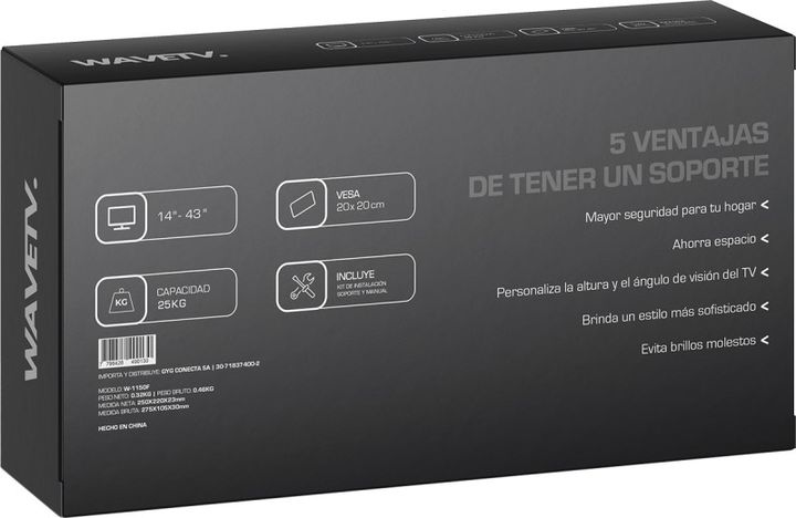 SOPORTE W-1150F PARA TV LED LCD WAVE-TV Soporte fijo para pantallas de 14 a 43 pulgadas, compatible con VESA 20x20 cm. Capacidad máxima de carga 25 kg. Diseño compacto y resistente sin opciones de movimiento ni inclinación. -Tipo: Fijo -Modelo W-1150F