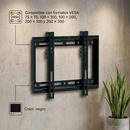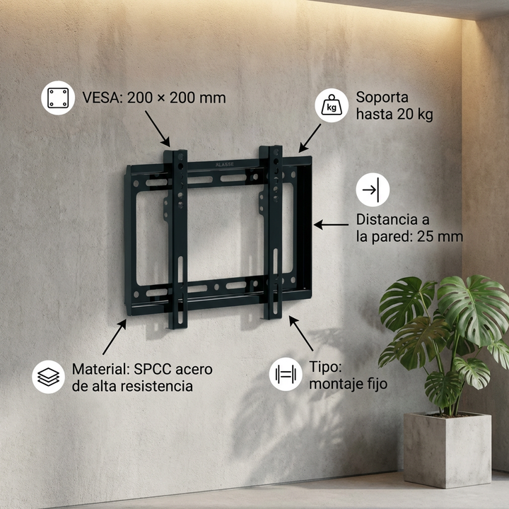 VESA: 200x200 mm. Compatible con formatos VESA: 75x75, 100x100, 100x200, 200x100, y 200x200. Soporta hasta 20 kg . Distancia a la pared: 25 mm. Material: SPCC acero de alta resistencia....
