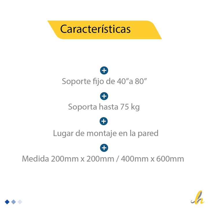 Marca: Kanji Modelo: Kjh-wmf80 Garantía: 12 Meses Características: - Soporte fijo de 40 a 80 - Medida: 200 mm x 200 mm / 400mm x 600 mm - Soporta hasta 75 kg - Lugares de montaje: Pared Los soportes para tv KANJIHOME son la solucion para optimizar el espacio de tu televisor LCD/LED y poder montarlo ...