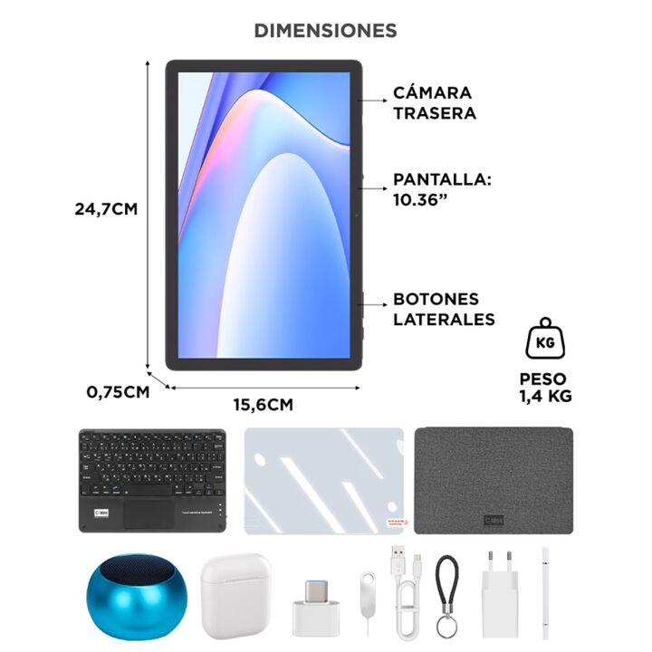 Pantalla 2K de 10.36” para una visualización cómoda y detallada: La Smart Tablet Gadnic 10.36” cuenta con pantalla Incell de 2000×1200 píxeles, que brinda imágenes nítidas y colores equilibrados. Mejora la experiencia al ver contenido multimedia, leer documentos o navegar durante períodos prolongado...