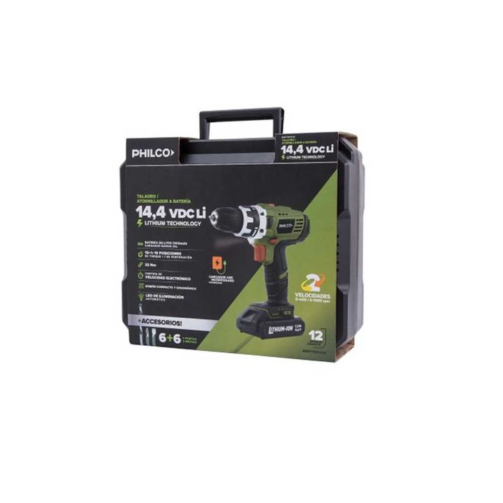 El Taladro Inalámbrico Philco TI1401 14.4 V tiene velocidad máxima de 1500 RPM, acción percusora no incluida, y torque 15+1. Incluye maletín, mechas y atornilladores para facilitar tus proyectos de bricolaje.