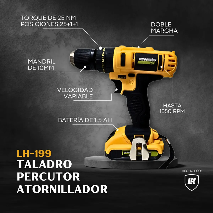 TALADRO LH-199 ATORNILLADOR PERCUTOR GP GARDEN PLUS DE LUSQTOFF 2 BATERIAS INALAMBRICO 12V MANDRIL 10MM CON REGULADOR DE VELOCIDAD El Taladro Atornillador Percutor GP Garden Plus de Lusqtoff es la herramienta ideal para quienes buscan versatilidad y potencia en sus proyectos de bricolaje y jardinerí...