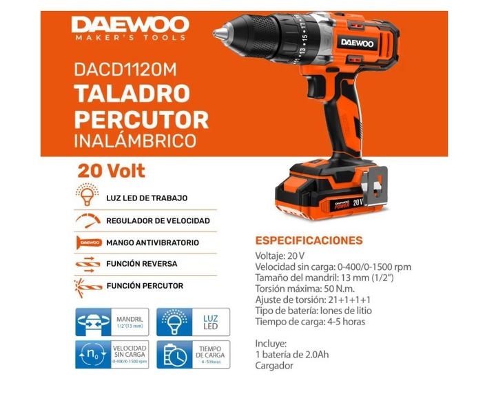 TALADRO ATORNILLADOR PERCUTOR INALÁMBRICO 20V DAEWOO DACD1120M El Taladro Atornillador Percutor Inalámbrico 20V Daewoo DACD1120M es una herramienta potente y versátil, ideal para trabajos de perforación y atornillado en diversos materiales. Equipado con una batería de litio de 2Ah, ofrece hasta 5 ho...