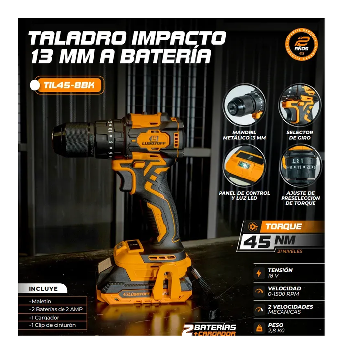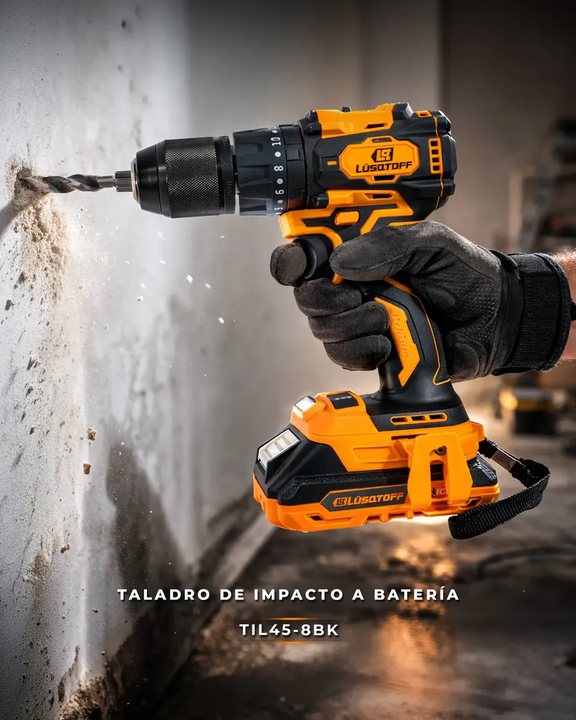 TALADRO PERCUTOR LUSQTOFF TIL45-8BK 13MM 18V MANDRIL METALICO • Engranaje de 2 velocidades para una conducción potente y una perforación rápida • Mandril Auto Ajustable para cambiar las herramientas de forma rápida y sencilla • Mandril Metálico Resistente • Diseño ergonómico con Softgrip para un fun...