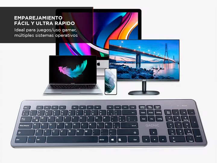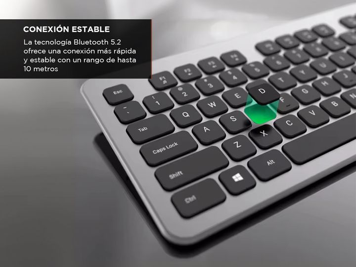 Equipado con tecnología Bluetooth 5.2 y conexión USB 2.4G, este teclado ofrece una compatibilidad excepcional con Windows, iOS y Android. Con 104 teclas de perfil bajo y un diseño ergonómico, garantiza una escritura cómoda y silenciosa. Su impresionante durabilidad, con una vida útil de 5 millones d...