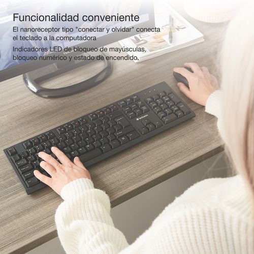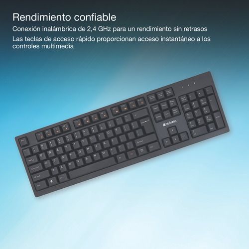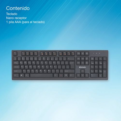 Teclado inalámbrico Verbatim slim receptor USB - 70738 Universalmente compatible Funciona para Windows, MacOS, Chrome OS, Linux Kernel 2.6 y versiones posteriores. Funcionalidad conveniente El nanoreceptor tipo conectar y olvidar conecta el teclado a la computadora Indicadores LED de bloqueo de mayú...