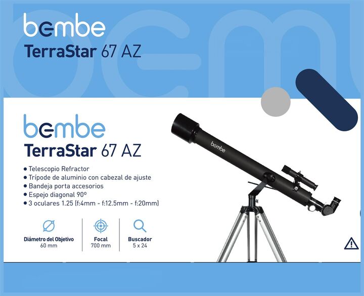 BEMBE telescopio 67AZ Ideal para iniciarse en la astronomía. Perfecto para observar planetas y constelaciones, incluso avistajes terrestres. Diseño Refractor y de fácil manejo, Con trípode de aluminio extensible, manual de instrucciones con conceptos de astronomía en español.