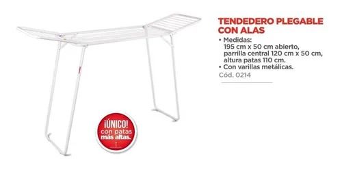 Tendedero plegable con alas. Con varillas metalicas. Dimensiones abierto 195x50cm. La altura de las patas es de 110cm.