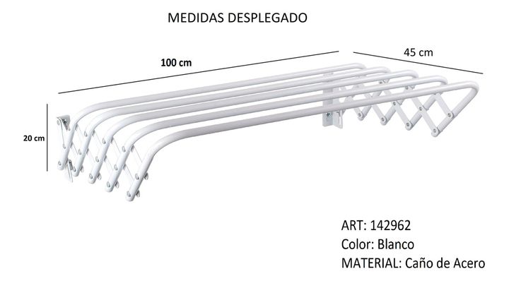 HOGAR ACTUAL TENDER P/PARED DE ACERO 100x45x20 SKU: 142962 Optimiza el espacio de tu hogar con el Tendedero Tender Pared Reforzado 100cm Acero Extensible de Hogar Actual. Este práctico y resistente tendedero de pared te permitirá secar tu ropa de manera eficiente y sin ocupar espacio en el suelo. Gr...